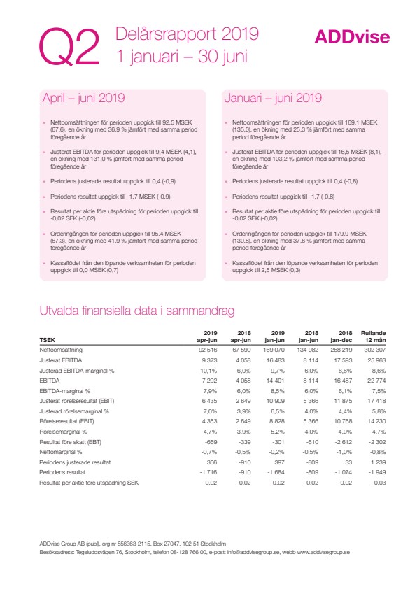 Denna information är sådan information som ADDvise är skyldigt att offentliggöra enligt EU:s marknadsmissbruksförordning samt lagen om värdepappersmarknaden. Informationen lämnades för offentliggörande den 23 juli 2019 kl. 09.15 CET.