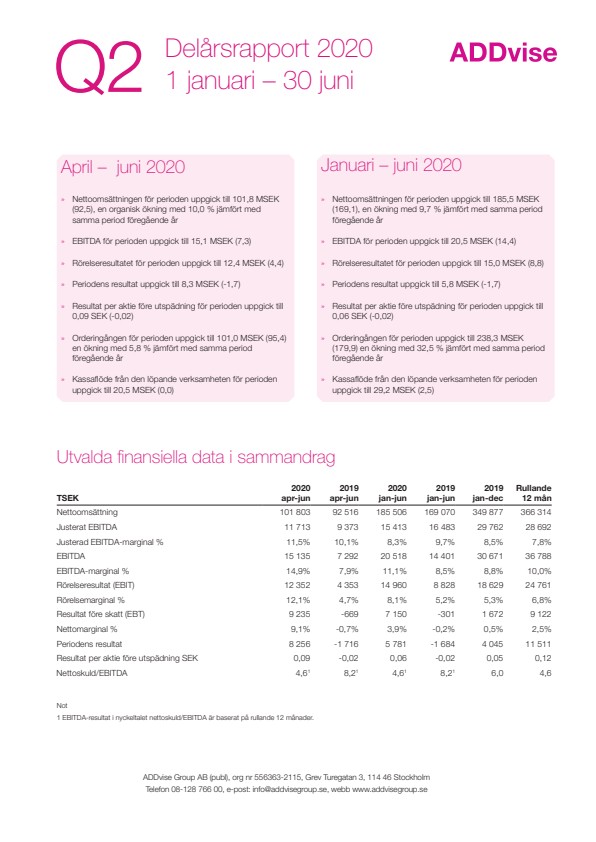 Denna information är sådan information som ADDvise Group AB är skyldiga att offentliggöra enligt EU:s marknadsmissbruksförordning samt lagen om värdepappersmarknaden. Informationen lämnades för offentliggörande den 24 juli 2020 kl. 08.45 CET.