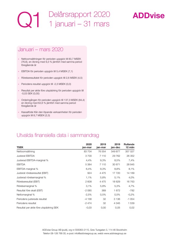 Denna information är sådan information som ADDvise Group AB är skyldiga att offentliggöra enligt EU:s marknadsmissbruksförordning samt lagen om värdepappersmarknaden. Informationen lämnades för offentliggörande den 24 april 2020 kl. 08.45 CET.