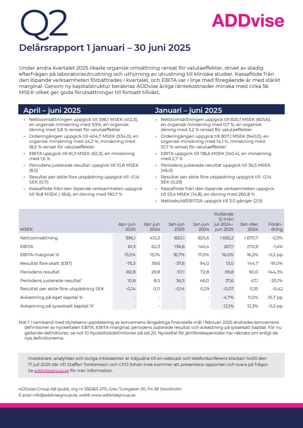 Under andra kvartalet 2025 ökade organisk omsättning rensat för valutaeffekter, drivet av stadig efterfrågan på laboratorieutrustning och uthyrning av utrustning till kliniska studier. Kassaflöde från den löpande verksamheten förbättrades i kvartalet, och EBITA var i linje med föregående år med stärkt marginal. Genom ny kapitalstruktur beräknas ADDvise årliga räntekostnader minska med cirka 56 MSEK vilket ger goda förutsättningar till fortsatt tillväxt.