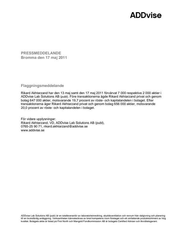 ADDvise Lab Solutions AB (publ) är en totalleverantör av laboratorieinredning, skyddsventilation och renrum från rådgivning och planering till en bruksfärdig anläggning. Verksamheten kännetecknas av bred kompetens inom företaget och ett omfattande produktsortiment av hög kvalitet. Bolagets aktie är listad på First North och Mangold Fondkommission AB är bolagets Certified Adviser och likviditetsgarant.