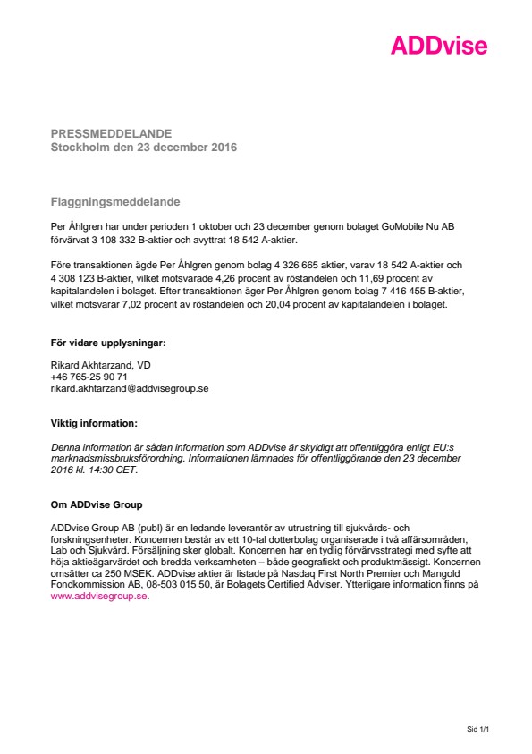 Denna information är sådan information som ADDvise är skyldigt att offentliggöra enligt EU:s marknadsmissbruksförordning. Informationen lämnades för offentliggörande den 23 december 2016 kl. 14:30 CET.