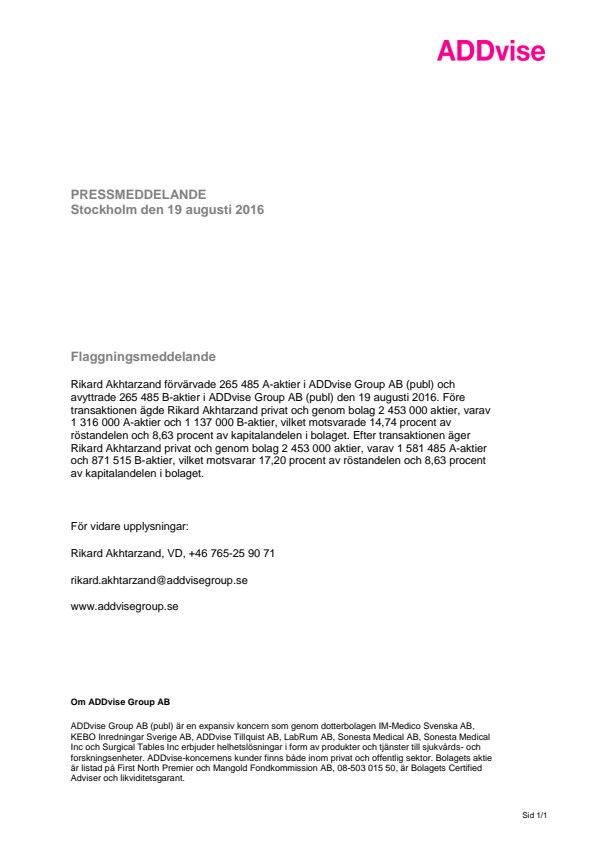 Denna information är sådan information som ADDvise Group AB (publ) är skyldigt att offentliggöra enligt EU:s marknadsmissbruksförordning. Informationen lämnades, genom ovanstående kontaktpersons försorg, för offentliggörande den 19 augusti 2016 kl. 10:57 CET.