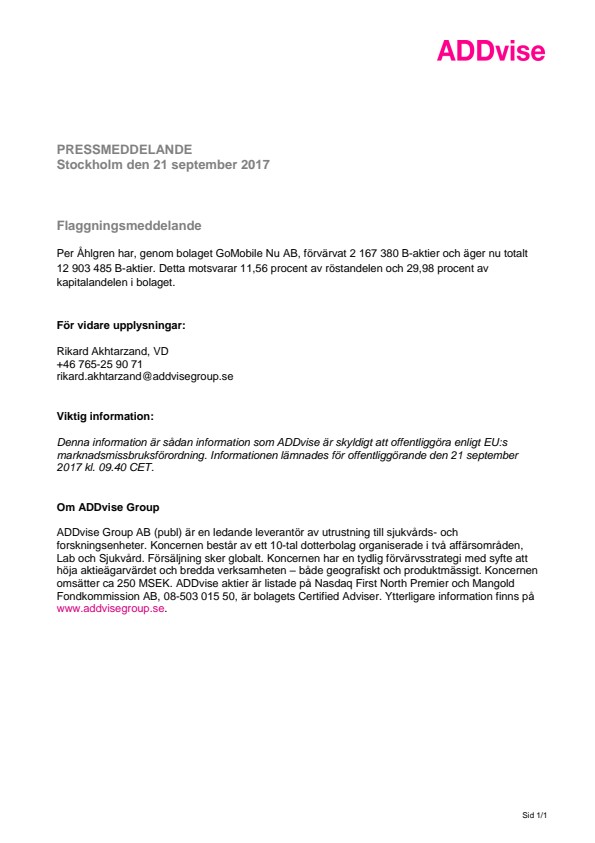 Denna information är sådan information som ADDvise är skyldigt att offentliggöra enligt EU:s marknadsmissbruksförordning. Informationen lämnades för offentliggörande den 21 september 2017 kl. 09.40 CET.