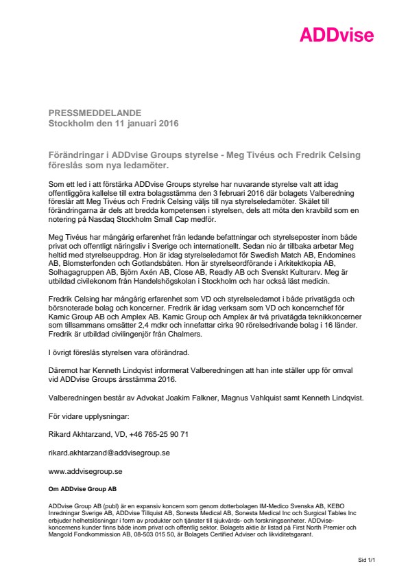 ADDvise Group AB (publ) är en expansiv koncern som genom dotterbolagen IM-Medico Svenska AB, KEBO Inredningar Sverige AB, ADDvise Tillquist AB, Sonesta Medical AB, Sonesta Medical Inc och Surgical Tables Inc erbjuder helhetslösningar i form av produkter och tjänster till sjukvårds- och forskningsenheter. ADDvise-koncernens kunder finns både inom privat och offentlig sektor. Bolagets aktie är listad på First North Premier och Mangold Fondkommission AB, 08-503 015 50, är Bolagets Certified Adviser och likviditetsgarant.