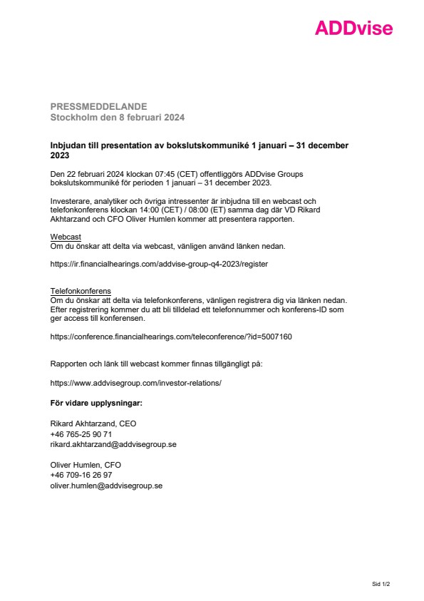 Den 22 februari 2024 klockan 07:45 (CET) offentliggörs ADDvise Groups bokslutskommuniké för perioden 1 januari – 31 december 2023.
