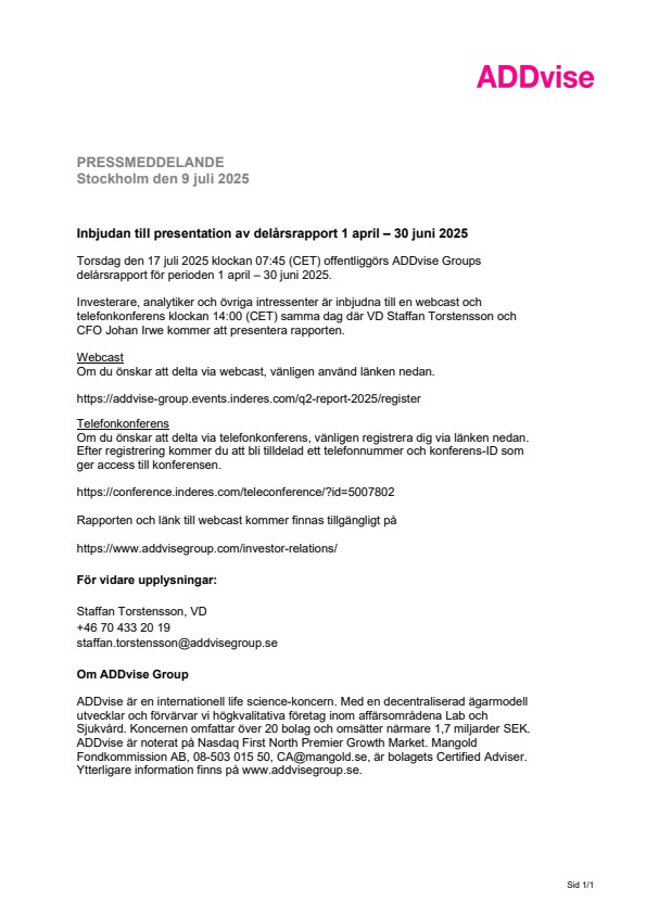Torsdag den 17 juli 2025 klockan 07:45 (CET) offentliggörs ADDvise Groups delårsrapport för perioden 1 april – 30 juni 2025.