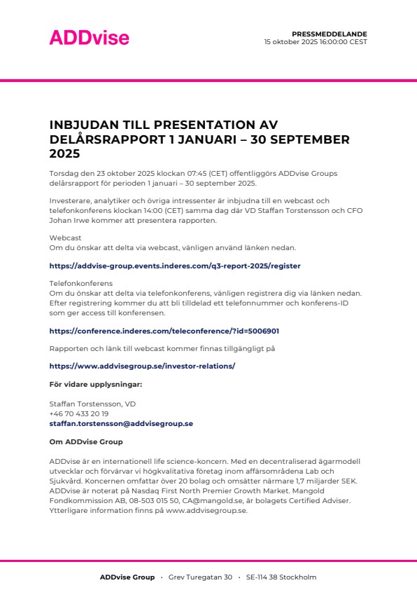 ADDvise är en internationell life science-koncern. Med en decentraliserad ägarmodell utvecklar och förvärvar vi högkvalitativa företag inom affärsområdena Lab och Sjukvård. Koncernen omfattar över 20 bolag och omsätter närmare 1,7 miljarder SEK. ADDvise är noterat på Nasdaq First North Premier Growth Market. Mangold Fondkommission AB, 08-503 015 50, CA@mangold.se, är bolagets Certified Adviser. Ytterligare information finns på www.addvisegroup.se.