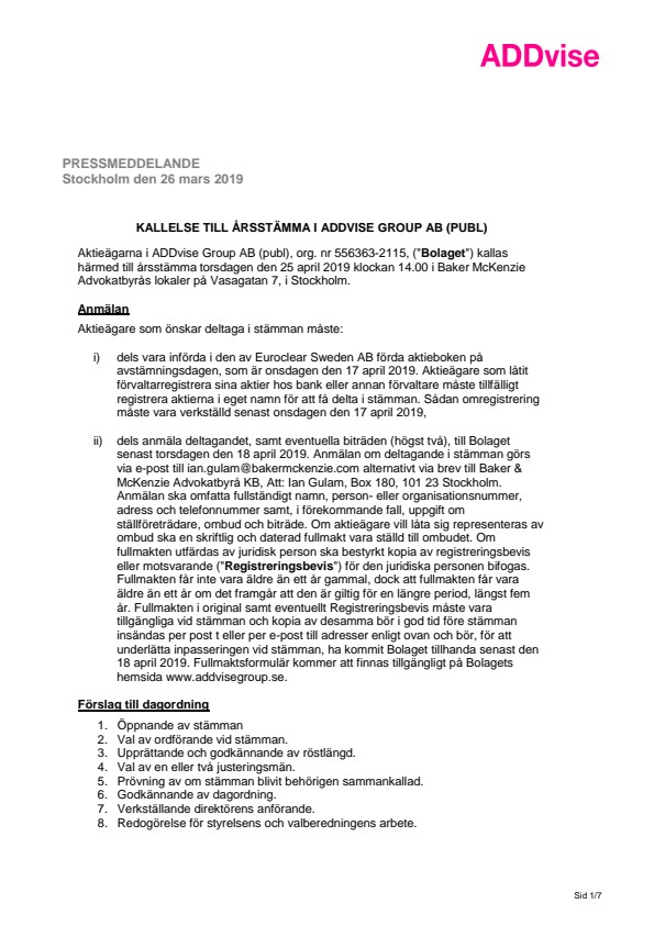 ii) dels anmäla deltagandet, samt eventuella biträden (högst två), till Bolaget senast torsdagen den 18 april 2019. Anmälan om deltagande i stämman görs via e-post till ian.gulam@bakermckenzie.com alternativt via brev till Baker & McKenzie Advokatbyrå KB, Att: Ian Gulam, Box 180, 101 23 Stockholm. Anmälan ska omfatta fullständigt namn, person- eller organisationsnummer, adress och telefonnummer samt, i förekommande fall, uppgift om ställföreträdare, ombud och biträde. Om aktieägare vill låta sig representeras av ombud ska en skriftlig och daterad fullmakt vara ställd till ombudet. Om fullmakten utfärdas av juridisk person ska bestyrkt kopia av registreringsbevis eller motsvarande (”Registreringsbevis”) för den juridiska personen bifogas. Fullmakten får inte vara äldre än ett år gammal, dock att fullmakten får vara äldre än ett år om det framgår att den är giltig för en längre period, längst fem år. Fullmakten i original samt eventuellt Registreringsbevis måste vara tillgängliga vid stämman och kopia av desamma bör i god tid före stämman insändas per post t eller per e-post till adresser enligt ovan och bör, för att underlätta inpasseringen vid stämman, ha kommit Bolaget tillhanda senast den 18 april 2019. Fullmaktsformulär kommer att finnas tillgängligt på Bolagets hemsida www.addvisegroup.se.