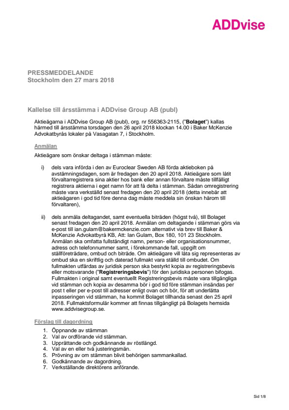 ii) dels anmäla deltagandet, samt eventuella biträden (högst två), till Bolaget senast fredagen den 20 april 2018. Anmälan om deltagande i stämman görs via e-post till ian.gulam@bakermckenzie.com alternativt via brev till Baker & McKenzie Advokatbyrå KB, Att: Ian Gulam, Box 180, 101 23 Stockholm. Anmälan ska omfatta fullständigt namn, person- eller organisationsnummer, adress och telefonnummer samt, i förekommande fall, uppgift om ställföreträdare, ombud och biträde. Om aktieägare vill låta sig representeras av ombud ska en skriftlig och daterad fullmakt vara ställd till ombudet. Om fullmakten utfärdas av juridisk person ska bestyrkt kopia av registreringsbevis eller motsvarande (”Registreringsbevis”) för den juridiska personen bifogas. Fullmakten i original samt eventuellt Registreringsbevis måste vara tillgängliga vid stämman och kopia av desamma bör i god tid före stämman insändas per post t eller per e-post till adresser enligt ovan och bör, för att underlätta inpasseringen vid stämman, ha kommit Bolaget tillhanda senast den 25 april 2018. Fullmaktsformulär kommer att finnas tillgängligt på Bolagets hemsida www.addvisegroup.se.