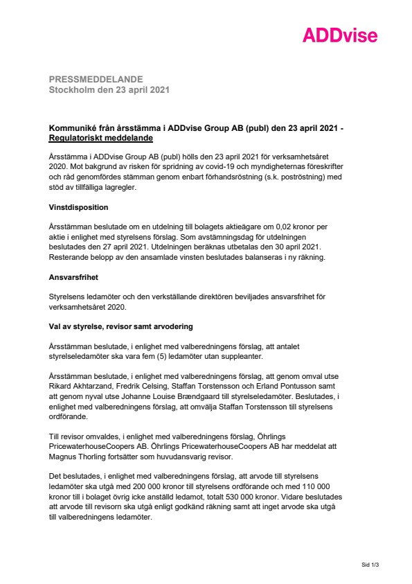 Kommuniké från årsstämma i ADDvise Group AB (publ) den 23 april 2021 – Regulatoriskt meddelande