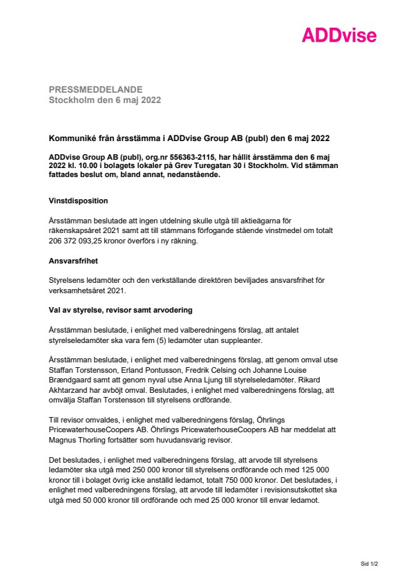 Kommuniké från årsstämma i ADDvise Group AB (publ) den 6 maj 2022