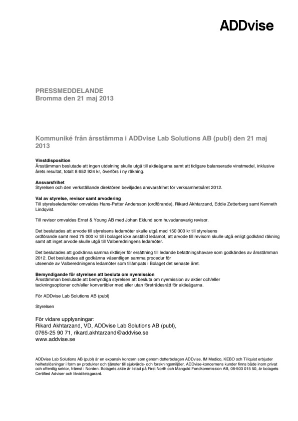 Kommuniké från årsstämma i ADDvise Lab Solutions AB (publ) den 21 maj 2013