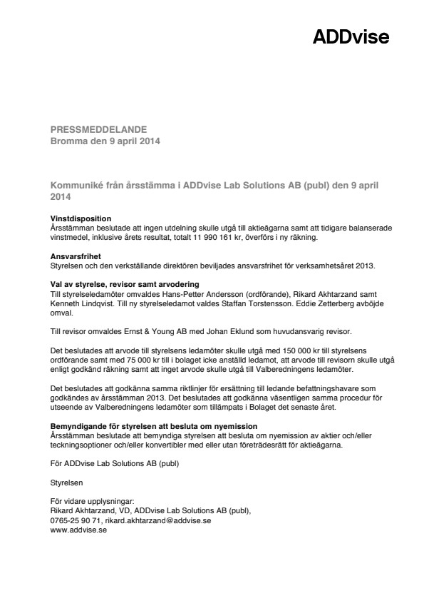 Kommuniké från årsstämma i ADDvise Lab Solutions AB (publ) den 9 april