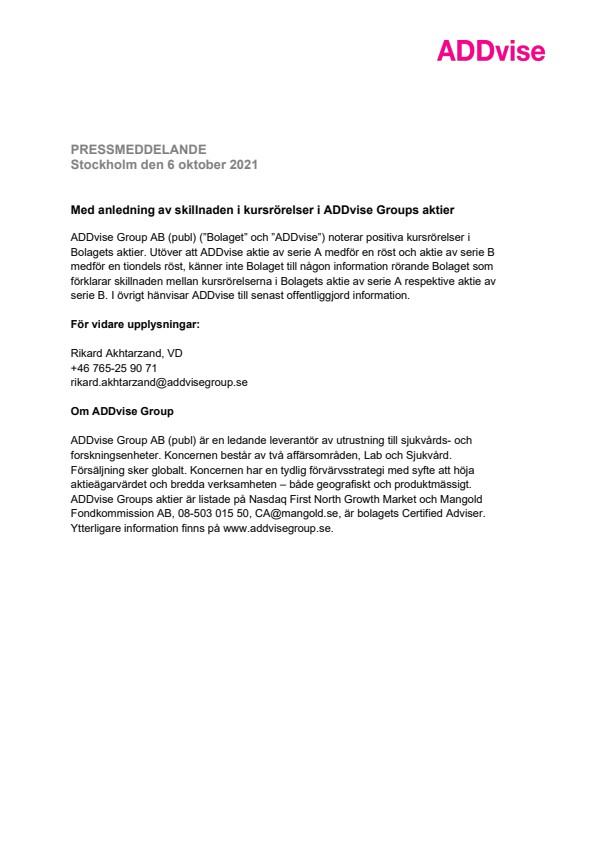 ADDvise Group AB (publ) (”Bolaget” och ”ADDvise”) noterar positiva kursrörelser i Bolagets aktier. Utöver att ADDvise aktie av serie A medför en röst och aktie av serie B medför en tiondels röst, känner inte Bolaget till någon information rörande Bolaget som förklarar skillnaden mellan kursrörelserna i Bolagets aktie av serie A respektive aktie av serie B. I övrigt hänvisar ADDvise till senast offentliggjord information.