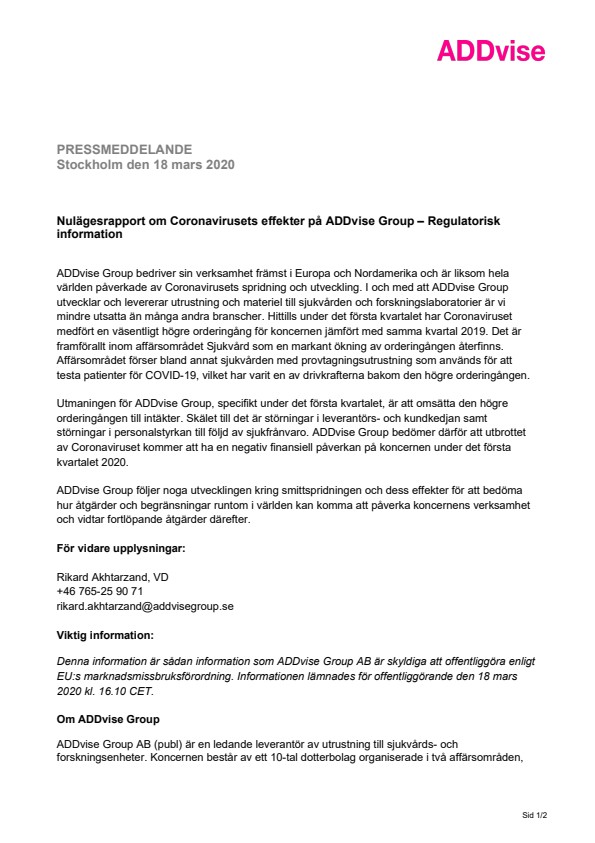 ADDvise Group bedriver sin verksamhet främst i Europa och Nordamerika och är liksom hela världen påverkade av Coronavirusets spridning och utveckling. I och med att ADDvise Group utvecklar och levererar utrustning och materiel till sjukvården och forskningslaboratorier är vi mindre utsatta än många andra branscher. Hittills under det första kvartalet har Coronaviruset medfört en väsentligt högre orderingång för koncernen jämfört med samma kvartal 2019. Det är framförallt inom affärsområdet Sjukvård som en markant ökning av orderingången återfinns. Affärsområdet förser bland annat sjukvården med provtagningsutrustning som används för att testa patienter för COVID-19, vilket har varit en av drivkrafterna bakom den högre orderingången.