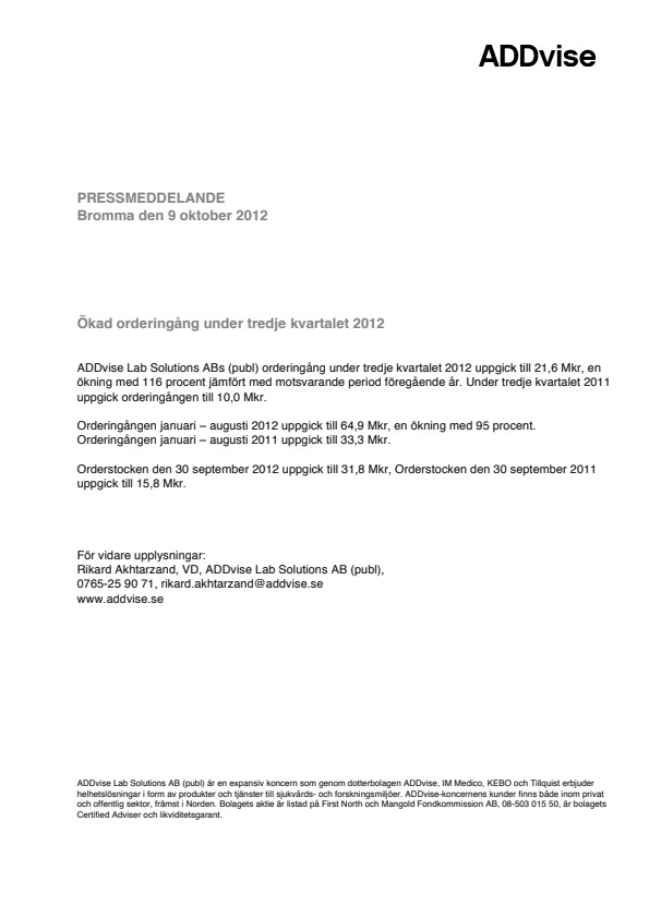 ADDvise Lab Solutions AB (publ) är en expansiv koncern som genom dotterbolagen ADDvise, IM Medico, KEBO och Tillquist erbjuder helhetslösningar i form av produkter och tjänster till sjukvårds- och forskningsmiljöer. ADDvise-koncernens kunder finns både inom privat och offentlig sektor, främst i Norden. Bolagets aktie är listad på First North och Mangold Fondkommission AB, 08-503 015 50, är bolagets Certified Adviser och likviditetsgarant.
