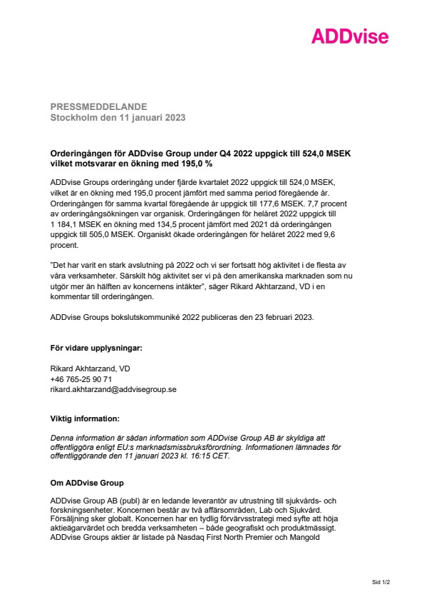Denna information är sådan information som ADDvise Group AB är skyldiga att offentliggöra enligt EU:s marknadsmissbruksförordning. Informationen lämnades för offentliggörande den 11 januari 2023 kl. 16:15 CET.