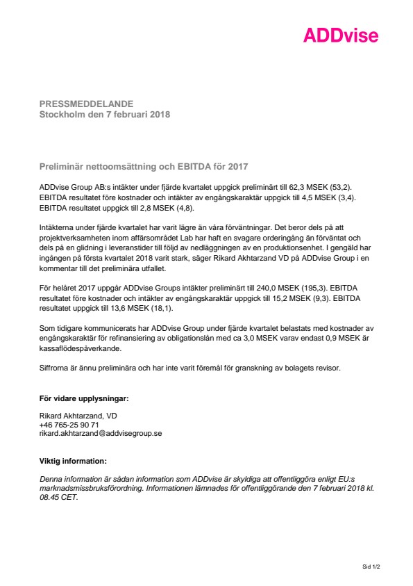Denna information är sådan information som ADDvise är skyldiga att offentliggöra enligt EU:s marknadsmissbruksförordning. Informationen lämnades för offentliggörande den 7 februari 2018 kl. 08.45 CET.