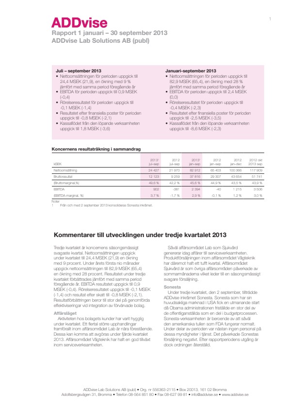 Under tredje kvartalet, den 2 september, tillträdde ADDvise inkråmet Sonesta. Sonesta som har sin huvudsakliga marknad i USA fick en utmanande start då Obama administrationen friställde en stor del av de offentliganställda som en del i budgetprocessen. Sonesta-verksamheten är beroende av att såväl den amerikanska tullen som FDA fungerar normalt. Under delar av perioden var nästan ingen personal på dessa myndigheter i tjänst. Det påverkade Sonestas försäljning negativt. Efter rapportperiodens utgång är dock ordningen återställd.