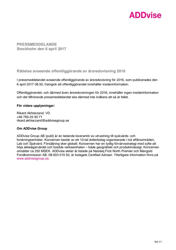 I pressmeddelandet avseende offentliggörande av årsredovisning för 2016, som publicerades den 6 april 2017 08.50, framgick att offentliggörandet innehåller insiderinformation.