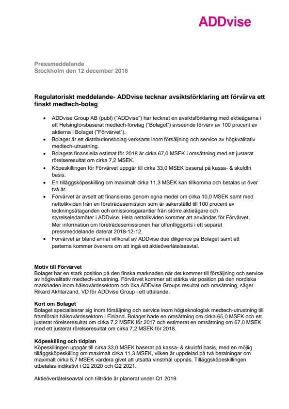 - ADDvise Group AB (publ) (”ADDvise”) har tecknat en avsiktsförklaring med aktieägarna i ett Helsingforsbaserat medtech-företag (”Bolaget”) avseende förvärv av 100 procent av aktierna i Bolaget (”Förvärvet”).