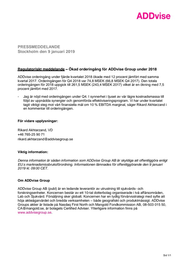 Denna information är sådan information som ADDvise Group AB är skyldiga att offentliggöra enligt EU:s marknadsmissbruksförordning. Informationen lämnades för offentliggörande den 9 januari 2019 kl. 09:00 CET.