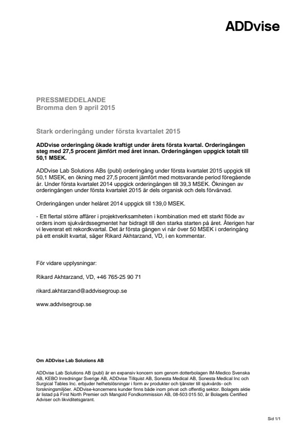 ADDvise Lab Solutions ABs (publ) orderingång under första kvartalet 2015 uppgick till 50,1 MSEK, en ökning med 27,5 procent jämfört med motsvarande period föregående år. Under första kvartalet 2014 uppgick orderingången till 39,3 MSEK. Ökningen av orderingången under första kvartalet 2015 är dels organisk och dels förvärvad.