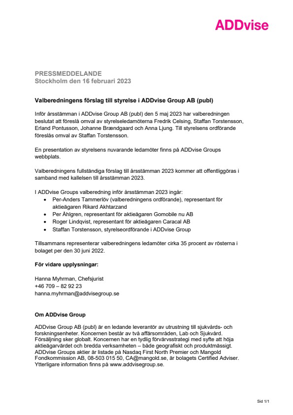 I ADDvise Groups valberedning inför årsstämman 2023 ingår: