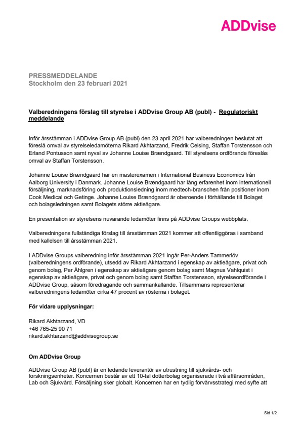 Inför årsstämman i ADDvise Group AB (publ) den 23 april 2021 har valberedningen beslutat att föreslå omval av styrelseledamöterna Rikard Akhtarzand, Fredrik Celsing, Staffan Torstensson och Erland Pontusson samt nyval av Johanne Louise Brændgaard. Till styrelsens ordförande föreslås omval av Staffan Torstensson.