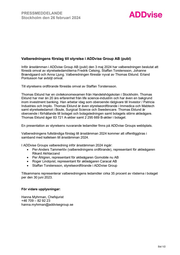 Inför årsstämman i ADDvise Group AB (publ) den 3 maj 2024 har valberedningen beslutat att föreslå omval av styrelseledamöterna Fredrik Celsing, Staffan Torstensson, Johanne Brændgaard och Anna Ljung. Valberedningen föreslår nyval av Thomas Eklund. Erland Pontusson har avböjt omval.